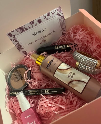 1 brume corps et cheveux, 1 mascara, 1 liner sourcils brun, 1 bracelet tendance, 1 mini brume de sac et 1 terracotta