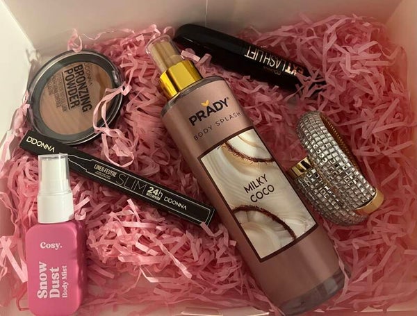 1 brume corps et cheveux, 1 mascara, 1 liner sourcils brun, 1 bracelet tendance, 1 mini brume de sac et 1 terracotta